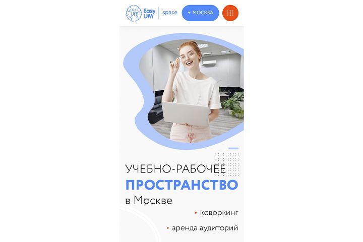 Дизайн для главной страницы учебно-рабочего пространства "Easy Um | space". Информация о коворкинге и компании, форма обратной связи.