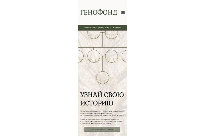 Некоммерческий проект "Генофонд" - генеалогическое древо семьи клиента. На сайте предусмотрена возможность регистрации и создания аккаунта, составления своей родословной и непосредственно древа, а также добавления фотографий в фотоальбом.