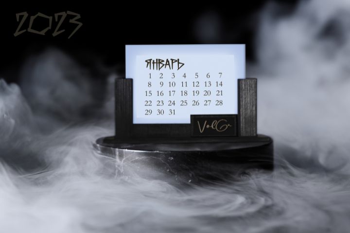 Основа календаря выполнена мною из дерева, также моё оформление и обработка фотографии в Adobe Photoshop.