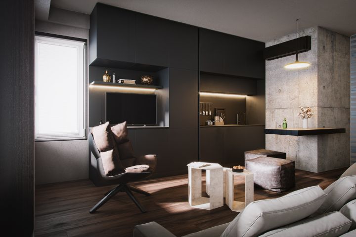 Интерьерная визуализация дизайна квартиры-студии выполненная в 3dsmax + corona