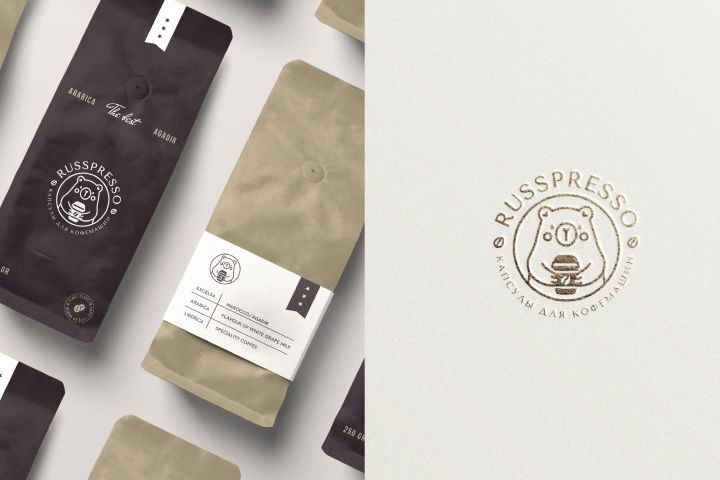 Логотип для бренда, продающего капсулы для кофемашин. Для логотипа был разработан персонаж медведя с кофейным стаканом, что является отсылкой к деятельности бренда.