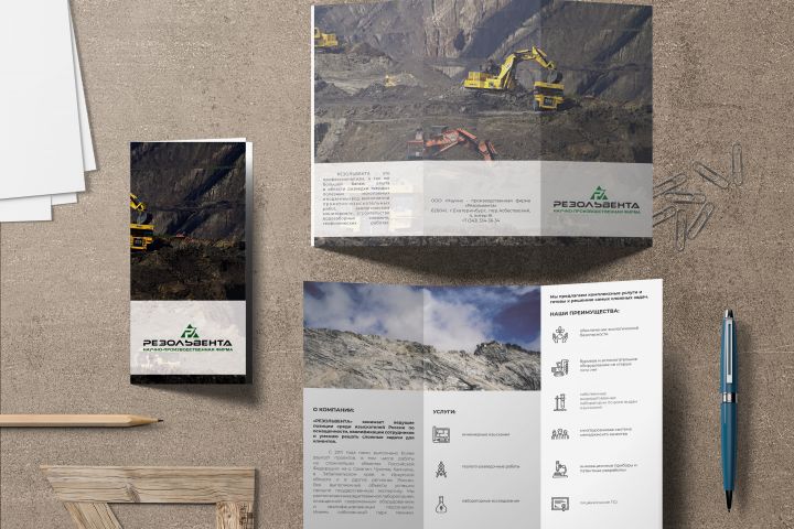 Разработка дизайна евробуклета для компании в сфере геологоразведки. Был использован для участия в отраслевой выставке.