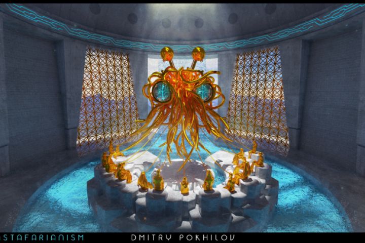 The Flying Spaghetti Monster (FSM) is the deity of the Church of the Flying Spaghetti Monster, or Pastafarianism, a social movement that promotes a light-hearted view of religion and originated in opposition to the teaching of intelligent design in public schools. According to adherents, Pastafarianism (a portmanteau of pasta and Rastafarianism) is a "real, legitimate religion, as much as any other".