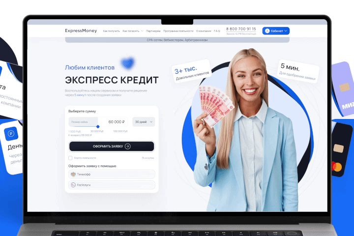 Разработать сайт с личным кабинетом и его сервисами, поднять статистику оформления займов за счет привлекательного дизайна и понятного интерфейса для получения и одобрения денег.