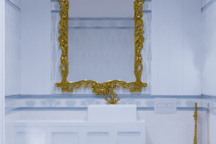 Дизайн ванной выполнен в классическом стиле в нежно-голубых оттенках в сочетании с белым.