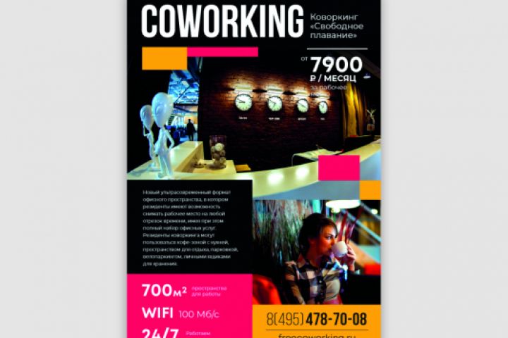 Рекламная афиша для коворкинг центра "Свободное плавание" размера 297х420мм (А3)