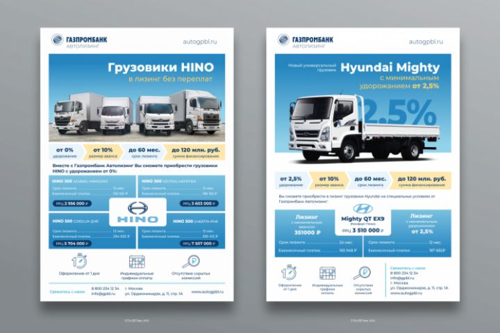 Две листовки формата А4 рекламирующие услуги лизинга компактных грузовиков для "Газпромбанк Автолизинг"