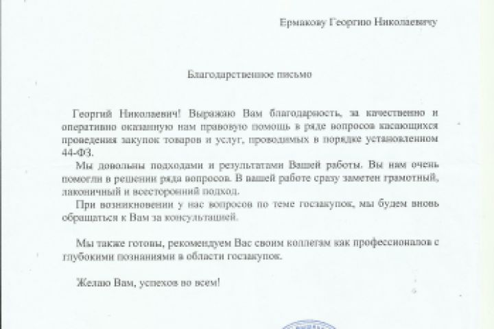 Благодарственное письмо мне вручили за помощь в организации закупочных процедур по строительно-ремонтному направлению. Я организовывал полную подготовку закупочной документации по 44-ФЗ и полное сопровождение проводимых закупочных процедур, до подписания контракта. Я организовывал конкурсы в результате чего в закупках одержали победу опытные известные поставщики и все контракты были полностью исполнены. Кроме того я решил ряд вопросов с контрольными органами, прокуратурой и ФАС. После этого Голова рекомендовал меня своим коллегам в другие гос. учреждения.
