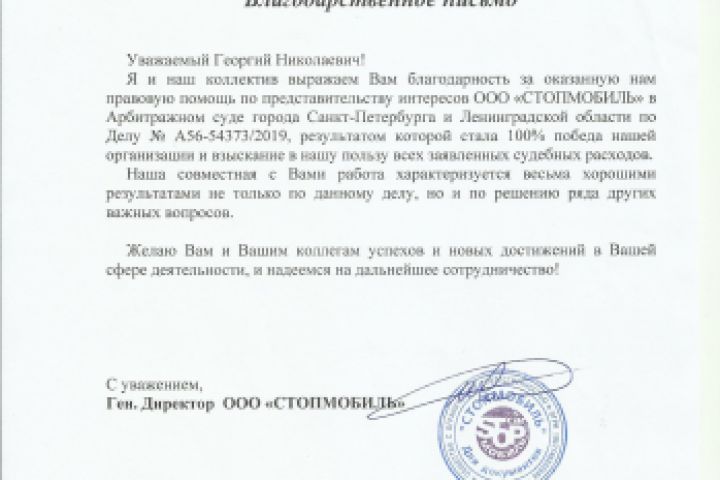 Благодарственное письмо я получил за представительство интересов ООО "Стопмобиль" в Арбитражном суде города Санкт-Петербурга и Ленинградской области. Клиент, будучи Ответчиком, даже не рассчитывал выиграть это дело, а просто просил оттянуть срок принятия судом решения. А я не только выиграл дело, добившись отказа в иске, я еще и взыскал все судебные расходы с Истца, и в том числе расходы на мое вознаграждение.