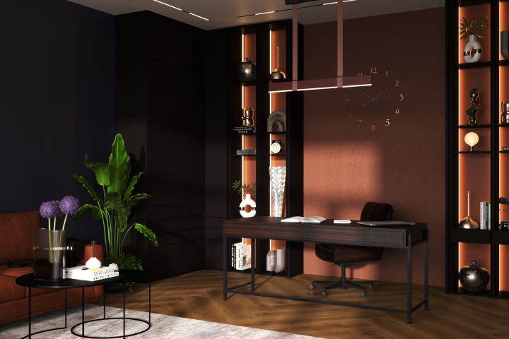 По просьбе заказчика выполнен в темных тонах. Кабинет предназначен не только для работы и деловых встреч, но и для расслабленной беседы перед камином и отдыха.