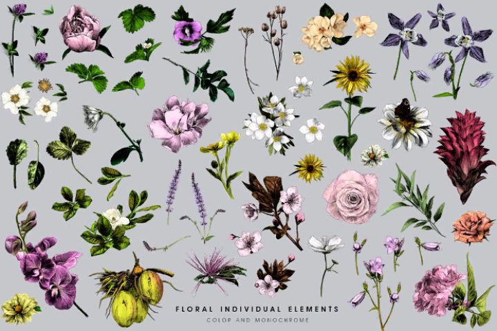 В него входят много цветочных элементов, цветочные композиции, рамки и принты