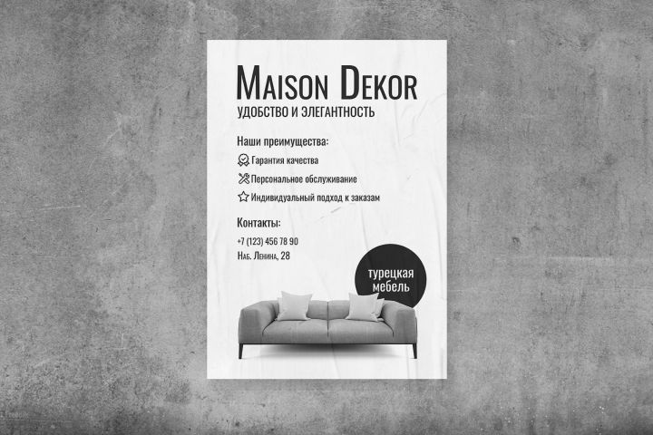 О компании: Компания "Maison Dekor" представляет собой фирму, специализирующуюся на продаже турецкой мебели Задание: Создать листовку, выполненную в минималистическом и строгом стиле с использованием нейтральных цветов. Листовка должна представлять информацию о преимуществах компании "Maison Dekor" для потенциальных клиентов. Решение: Был разработан дизайн в белых и серых тонах, для создания элегантной и сдержанной атмосферы. Для подчеркивания статуса компании Maison Dekor был выбран строгий шрифт. Был создан блок с информацией о преимуществах нашей компании, чтобы клиенты могли легко ознакомиться с нашими достоинствами. Чтобы избежать однообразности, в дизайн было включено фото дивана, добавляет некоторую вариативность. Некоторые мокапы и изображение были взяты с сайта-https://ru.freepik.com/ Некоторые иконки были взяты с сайта- https://icons8.ru/icons
