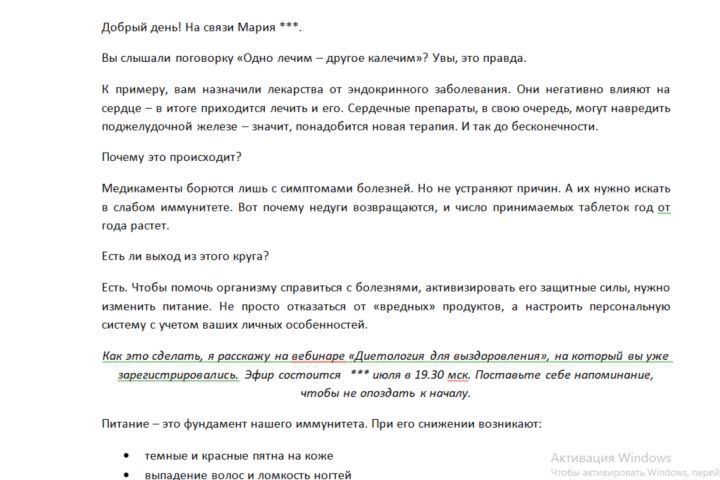 Письмо врача-диетолога о предстоящем бесплатном вебинаре. Полный текст во вложении.