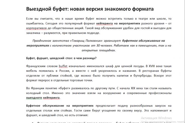 Статья для сайта кейтеринговой компании с элементами SEO.