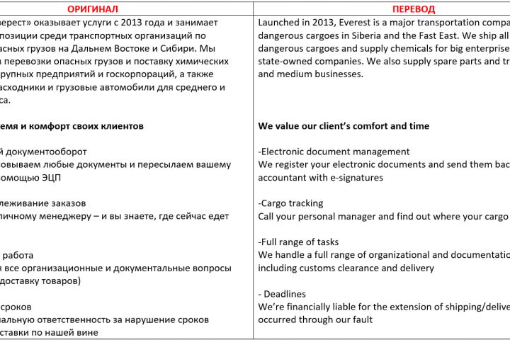 Для сайта транспортной компании "Эверест", перевод на английский