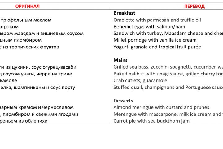 Фрагмент меню ресторана, перевод на английский