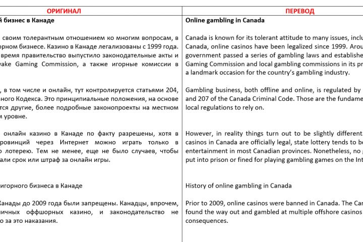 Текст про игорный бизнес (гемблинг) в Канаде, перевод на английский
