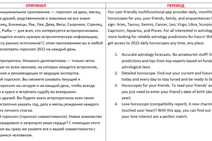 Мобильное приложение-гороскоп, перевод на английский
