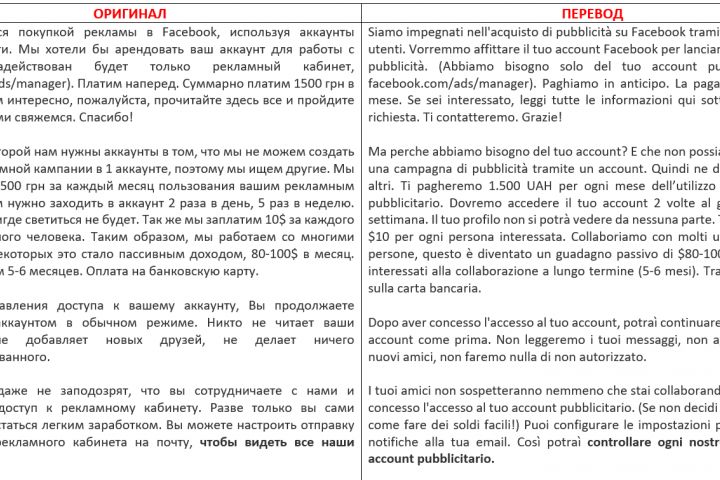 Текст о рекламе в Фейсбуке, перевод на итальянский
