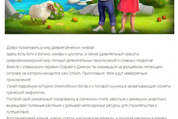 Ферма в древнегреческих декорациях. Парень и девушка из современного мира попадают в мир мифов Древней Греции, знакомятся с богами, выполняют различные задания и совершают подвиги. Игра без избыточного пафоса и философствований - легкая, ненапряжная, много юмора.