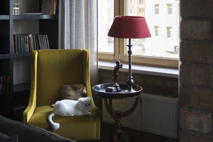 Современный и функциональный интерьер, учитывающий увлечение заказчиков коллекционированием книг и предметов искусства. Изначальный объём, свободный от перегородок, поделили на две части, большую из которых заняла дневная зона. В неё включили не только гостиную, столовую и кухню, но и прихожую и библиотеку, организованную в эркере.