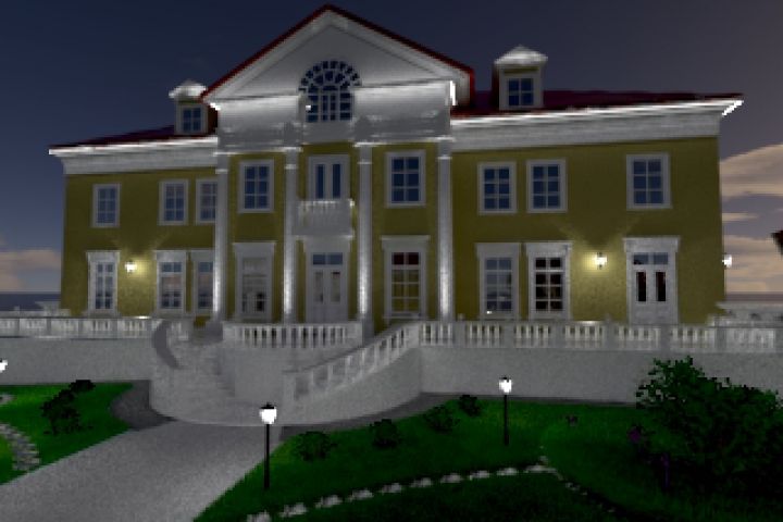 Моделлинг, текстурирование, визуализация загородного дома. Исходный материал - чертежи. Расстановка источников света по участку согласно схеме, подсветка фасадов - подбор точек исходя из некоторых оговорённых возможностей.