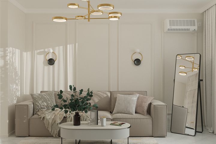 Проект гостиной в модном бежевом цвете с молдингами, современными панелями и рейками. планировкой гардероба