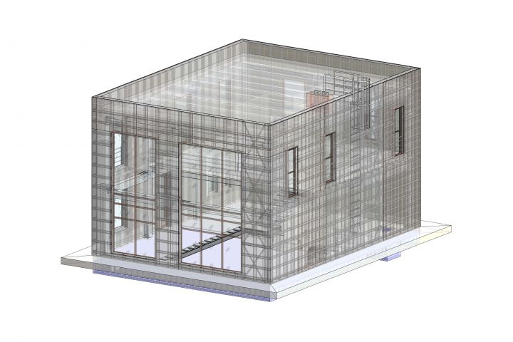Был запроектирован типовой индивидуальный жилой дом, согласно ТЗ заказчика, на железобетонном каркасе, с применением ЛСТК в качестве ограждающих конструкций. Разработаны несколько типов фундаментов, рабочая документация на объект (раздел АС) и BIM- модель здания в формате RVT