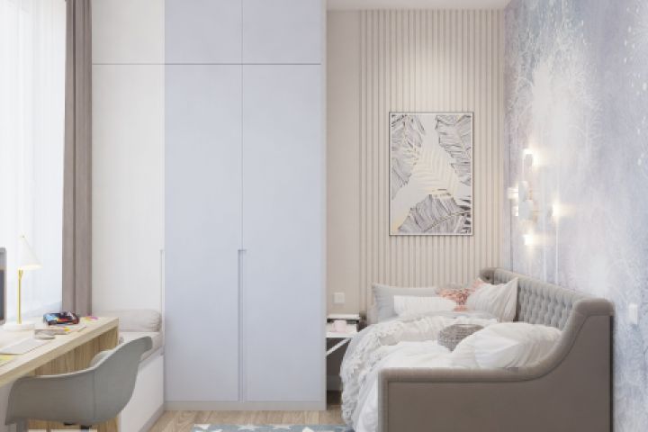 Интерьер квартиры для молодой семьи с двумя детьми оформлен в светлых нейтральных тонах. Главная задача в проекте – максимальная функциональность и правильная организация пространства. Мы предусмотрели большую и уютную кухню-гостиную, две детские для мальчика и девочки, гостевую комнату, спальню для родителей с ванной, светлую прихожую с гардеробной, общий сан. узел и даже постирочную. Цвета для проекта были выбраны светлые и нейтральные. Яркий акцент вы можете видеть на кухне. В качестве фартука был выбран рисунок, покрытие моющееся. В данной квартире у каждого члена семьи есть своя комната, но при этом есть большое пространство с возможностью собраться всем вместе.