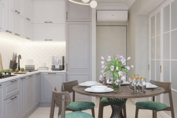Кухня и гостиная в данном проекте разделены раздвижными стеклянными перегородками. Заказчикам хотелось иметь открытое пространство, но в то же время возможность разделить два этих помещения. Сам интерьер выполнен из пастельных оттенков с применением различных контрастных деталей. Особое внимание в проекте привлекает детская комната. Зонирование в комнате осуществляется за счёт двухуровневого потолка, который выкрашен в яркий цвет. Помимо данного решения в комнате достаточно контрастная мебель, но при этом всё ещё присутствуют пастельные тона.