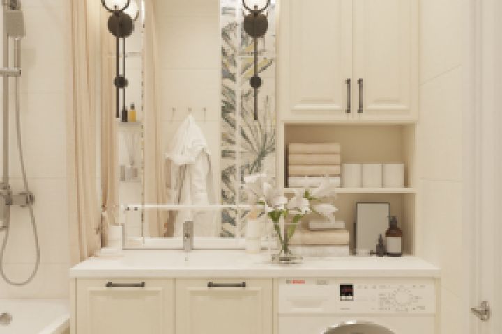 Кухня и гостиная в данном проекте разделены раздвижными стеклянными перегородками. Заказчикам хотелось иметь открытое пространство, но в то же время возможность разделить два этих помещения. Сам интерьер выполнен из пастельных оттенков с применением различных контрастных деталей. Особое внимание в проекте привлекает детская комната. Зонирование в комнате осуществляется за счёт двухуровневого потолка, который выкрашен в яркий цвет. Помимо данного решения в комнате достаточно контрастная мебель, но при этом всё ещё присутствуют пастельные тона.
