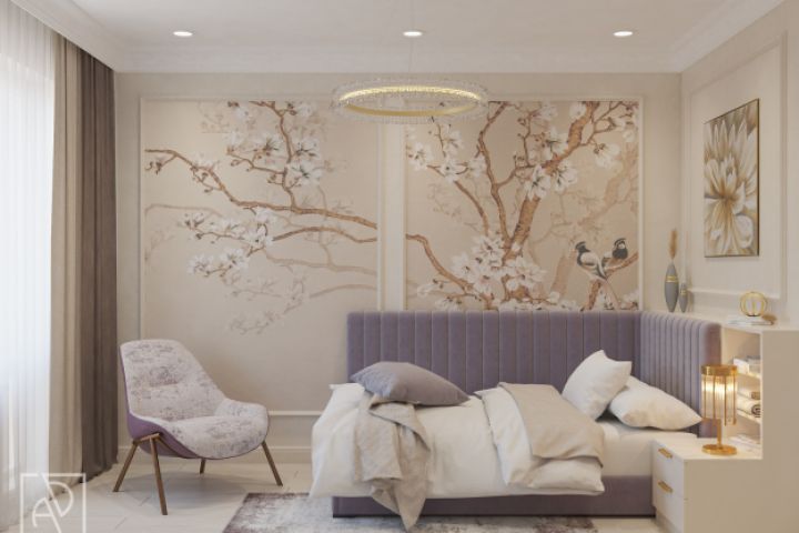 Кухня и гостиная в данном проекте разделены раздвижными стеклянными перегородками. Заказчикам хотелось иметь открытое пространство, но в то же время возможность разделить два этих помещения. Сам интерьер выполнен из пастельных оттенков с применением различных контрастных деталей. Особое внимание в проекте привлекает детская комната. Зонирование в комнате осуществляется за счёт двухуровневого потолка, который выкрашен в яркий цвет. Помимо данного решения в комнате достаточно контрастная мебель, но при этом всё ещё присутствуют пастельные тона.
