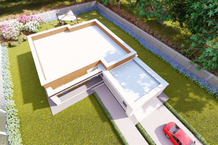 Проект индивидуального жилого дома в современном стиле (вид на участок сверху)