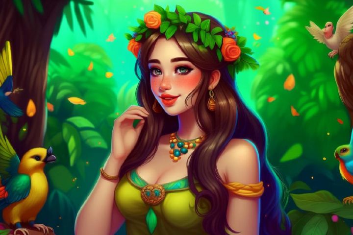 Создать мультяшного героя. Лесная фея, молодая, красивая. Волосы русые ,глаза голубые, губы алые ,пухлые. В волосах венок из желтых цветов и ярко зеленных листьев. На шее ожерелье золотое с вставками изумрудов. Руки подняты к небу, на руке сидит синица. Вокруг тропический лес.
