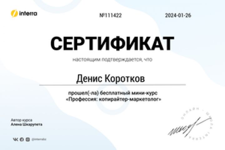 Сертефикат, полученный при прохождении онлайн курсов на сайте interr