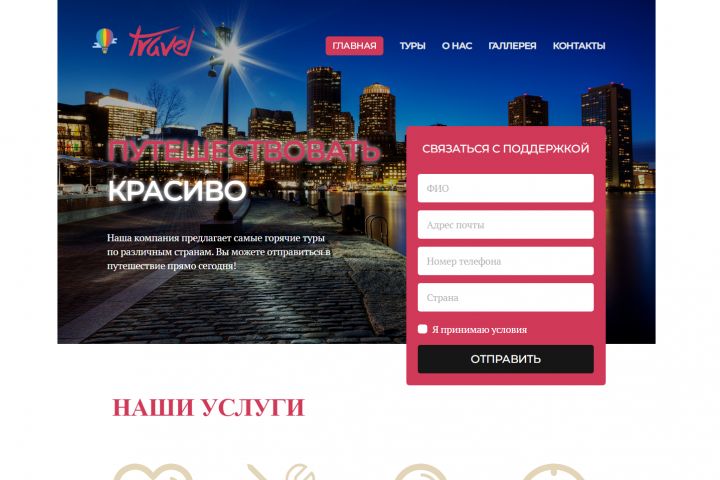 Сайт турагенства с открытыми путевками в страны по всему миру. Удобная форма связи, выбор и покупка туристических путевок.