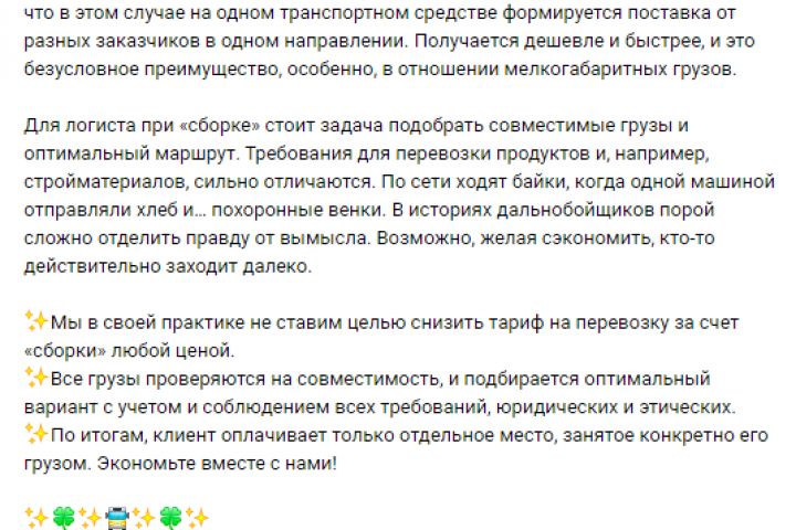 Пост в сети вконтакте для группы ТЭК, разъясняющий клиентам выгоду при выборе услуги "сборный груз"