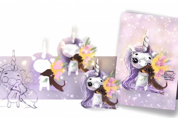 Этапы рисования открытки к 8 марта с единорогом и весенним букетом
