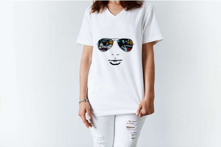 Принт иллюстрирует идею заказчика, зашифрованное послание. В очках отражение кадра из фильма «Отель «Миллион долларов»»