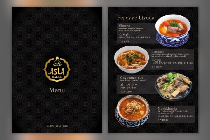 Меню для ресторана среднеазиатской кухни в Южной Корее "Азия" (показаны первые две страницы). Разработка дизайна, вёрстка, полная предпечатная подготовка.