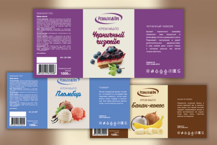 Разработка дизайна этикетки для крем-мыла (7 ароматов). Полная предпечатная подготовка макетов.