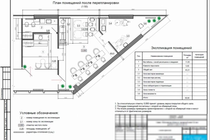 Данный дизайн-проект выполнен без визуализаций, т.к. заказчику была необходима только рабочая документация. Помещения новые с новой отделкой, проект ограничился планировкой, чертежами и ведомостями.
