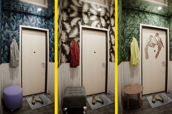 Клиент обратился с просьбой помочь подобрать и визуализировать разные варианты оклейкой помещения обоями. Обои рассматривались в каталогах магазинов Аксон, Леруа Мерлен. Представлены 3 наиболее понравившихся клиенту варианта.