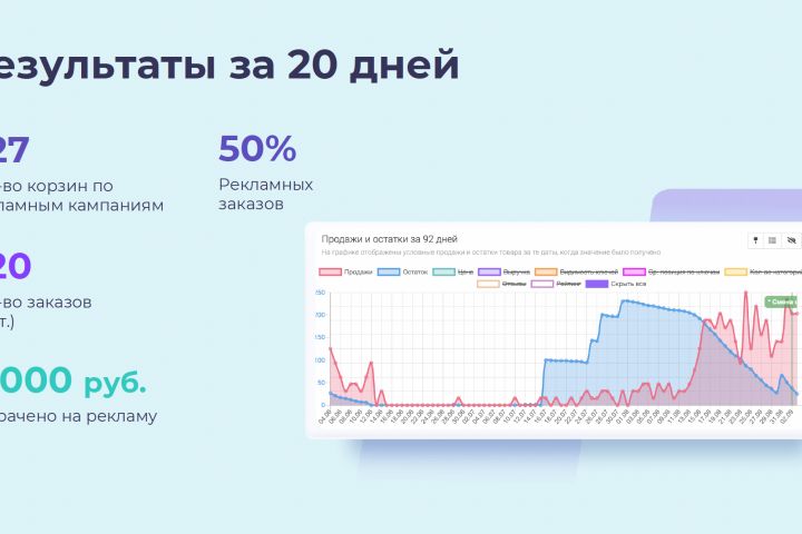 • Анализ размещения по всем этапам воронки от показа до продажи, увеличение объемов продаж, формирование предложений по продвижению карточек товара;