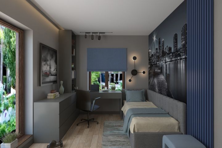 Функциональная комната для подростка выполнена в серых и синих тонах.