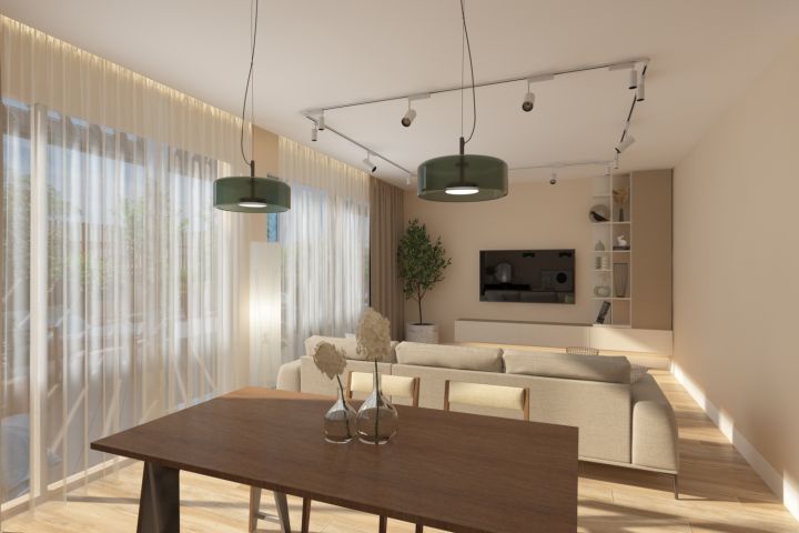 Дизайн проект гостиной на Кипре выполнен в светлых натуральных тонах