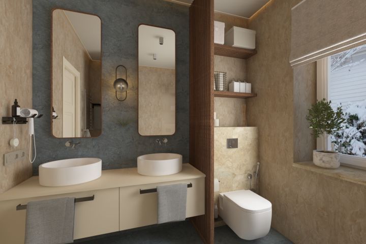 Небольшую площадь получилось зонировать,зона умывания разделена с санузлом реечной перегородкой,над инсталяцией не стали закрывать полки дверцами,установили реечные полки для переклички с перегородками