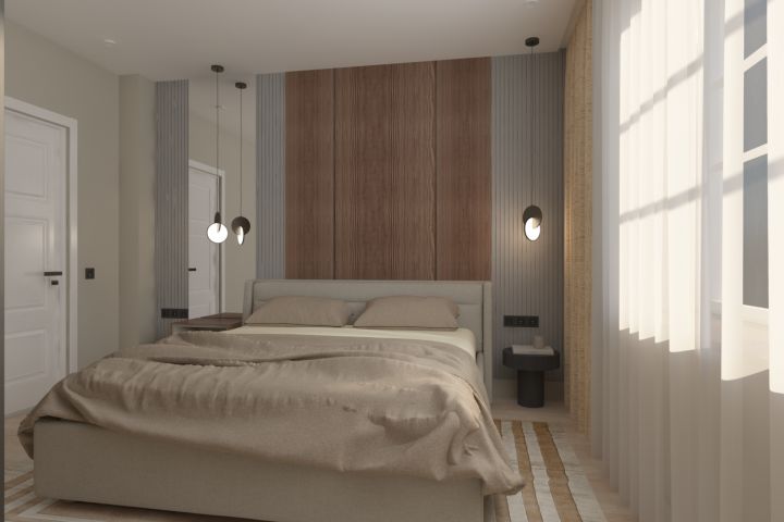 Спальня в спокойных натуральных тонах.Люблю ассиметрию,она сейчас актуальна в современных интерьерах,придает разнообразие помещению.