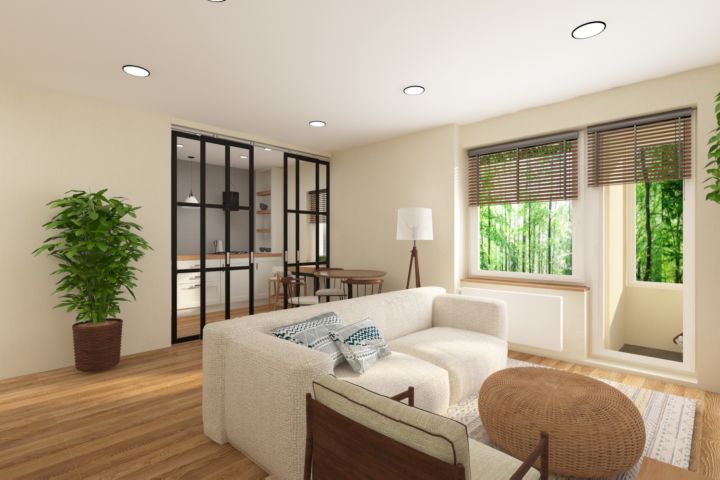 2х комнатная квартира для молодой женщины.Выбрали легкий уютный сканди Кухню объединили с гостиной через перегородку.Разместили небольшую обеденную зону и рабочий уголок