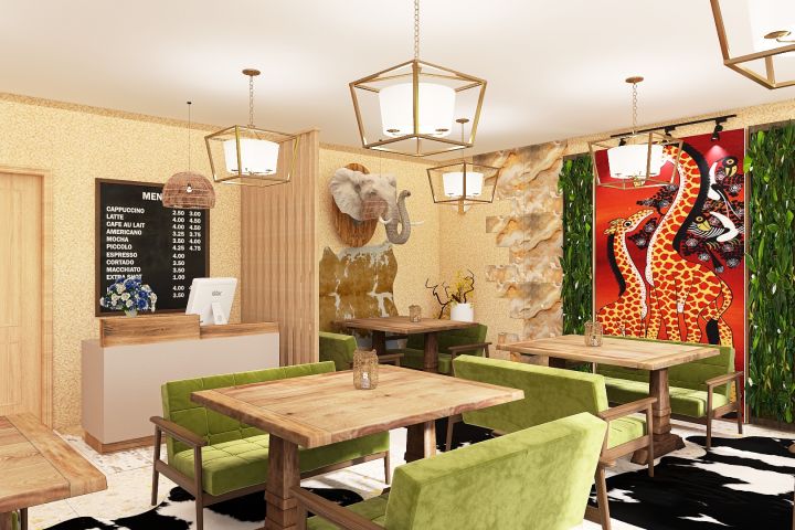 Яркий, стильный и веселый дизайн кафе с изображением жирафов, голов слонов и пейзажей саваны сделали это кафе популярным для посещения всей семьей. Расчет энергетики пространства показал, что в главном помещении — зале для гостей находятся благоприятные энергии, которые нужно усиливать и применять в таких случаях любую цветовую палитру и фактуры.
